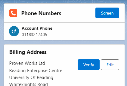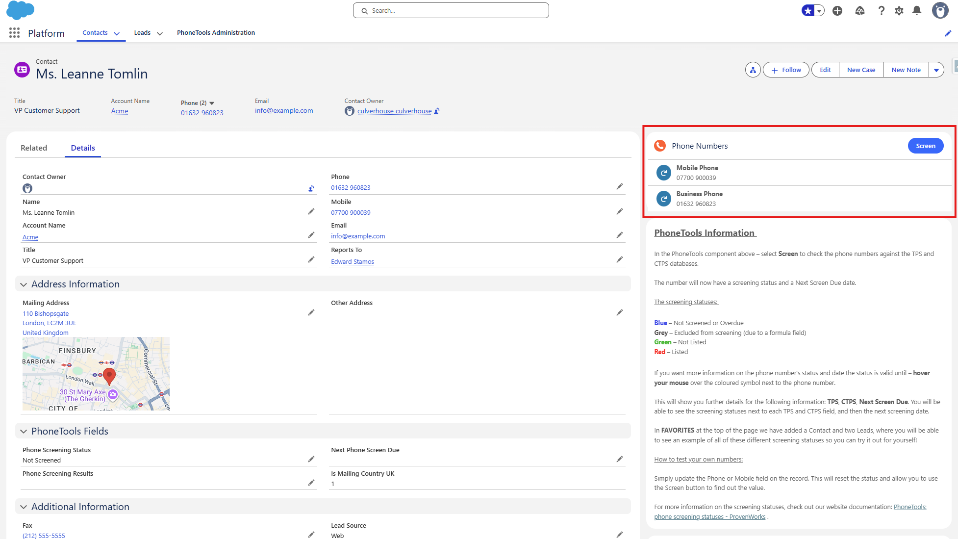 These statuses are displayed in the PhoneTools lightning record page component alongside each of the phone numbers that are configured for screening – additional information is revealed by hovering your mouse over the status icon.
