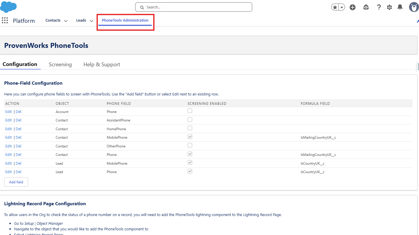 The Grey – Excluded from screening status only appears if there is a formula field present and the number does not meet the requirements to be screened with PhoneTools. For example, in the Trialforce org any Lead or Contact record without a UK address will be excluded from screening due to the formula field created.
