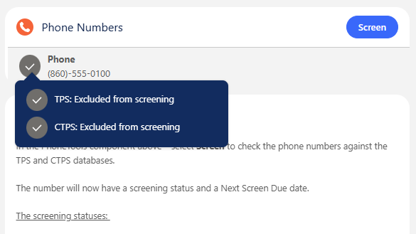 - Not Screened – The record contains phone numbers that have not yet been screened against the configured databases or are excluded.