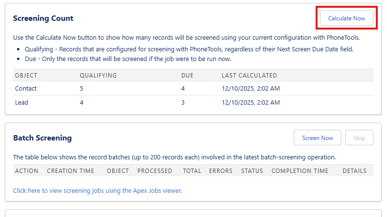 PhoneTools will populate a Next Screen Due date 21 days from the initial screening where the status will change to Due for screening to remind you to rescreen all numbers within the 28-day legal requirement. It is recommended to automatically screen records enabling the inbuild functionality. This will process all Not Checked/ Due for screening numbers at a daily time, or for further customisation you can create a Flow to programmatically fire screening.